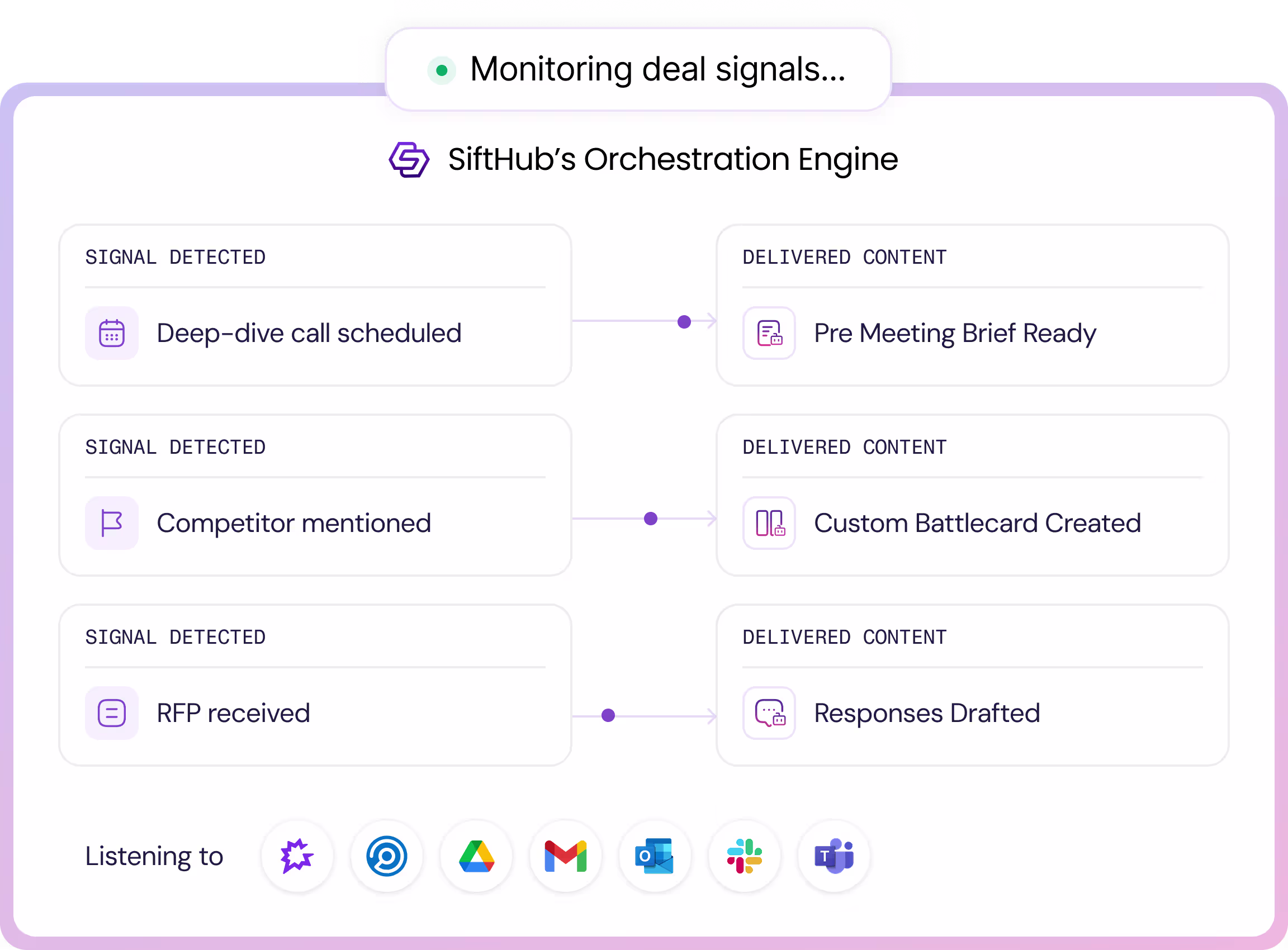 Yes. SiftHub’s AI platform has out-of-the-box integrations with several popular workplace apps including Google Drive, Confluence, Zendesk, Salesforce, Gong, Clari, Hubspot, Notion, and more. To know more, check out our Connectors page.
