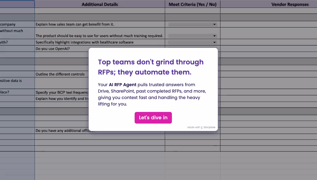 Your RFP Agent was trained for the high-stakes world of enterprise questionnaire responses. It understands your docs, taps into the best answers in your Google Drive, Q&A library, Slack threads, etc., and handles the heavy lifting – allowing you to focus on high-impact work.