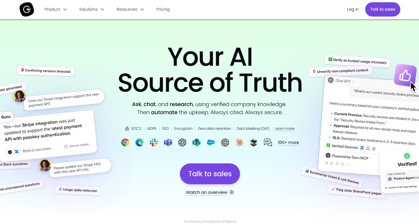 Guru organizes company knowledge into verified ‘cards.’ It delivers answers directly inside Slack, your browser, and Salesforce, so reps get relevant knowledge without switching tabs.
