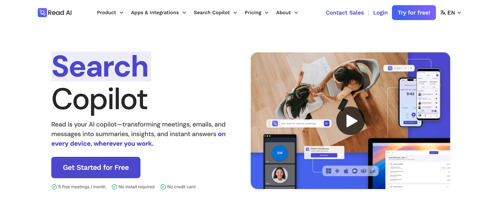 Its Search Copilot answers natural language questions across all connected platforms. Read AI users attend 20% fewer meetings on average.