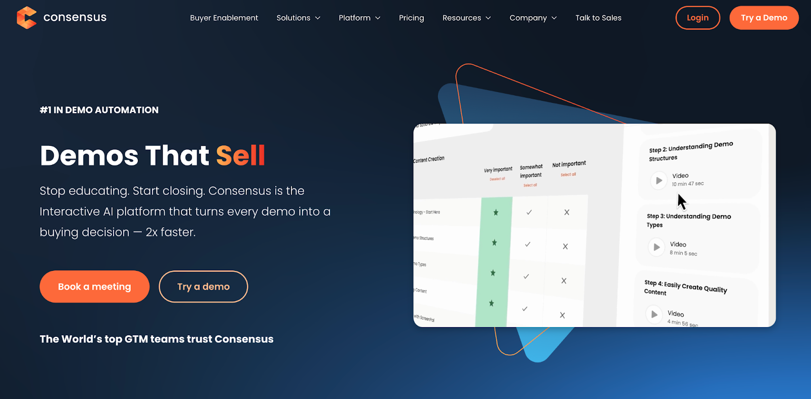Consensus is the leading demo automation platform for presales teams. It lets SEs build a library of personalized, interactive video demos that AEs can send on demand, without SE involvement, for every introductory call.