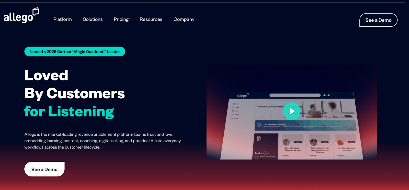 Allego is a revenue enablement platform that unifies content management, learning, coaching, and digital selling in a single application. It is named a Leader in the 2025 Gartner Magic Quadrant for Revenue Enablement Platforms.