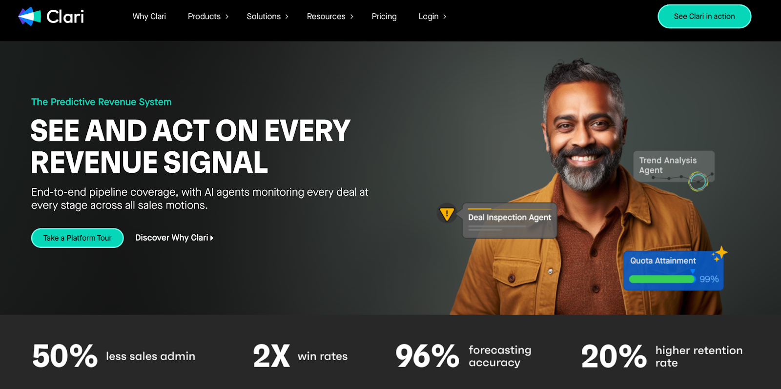 Clari combines CRM data, activity signals, and engagement patterns to forecast revenue and inspect deal health. Sales leaders use it to manage team forecasts and identify at-risk deals based on signals beyond CRM stage progression alone.