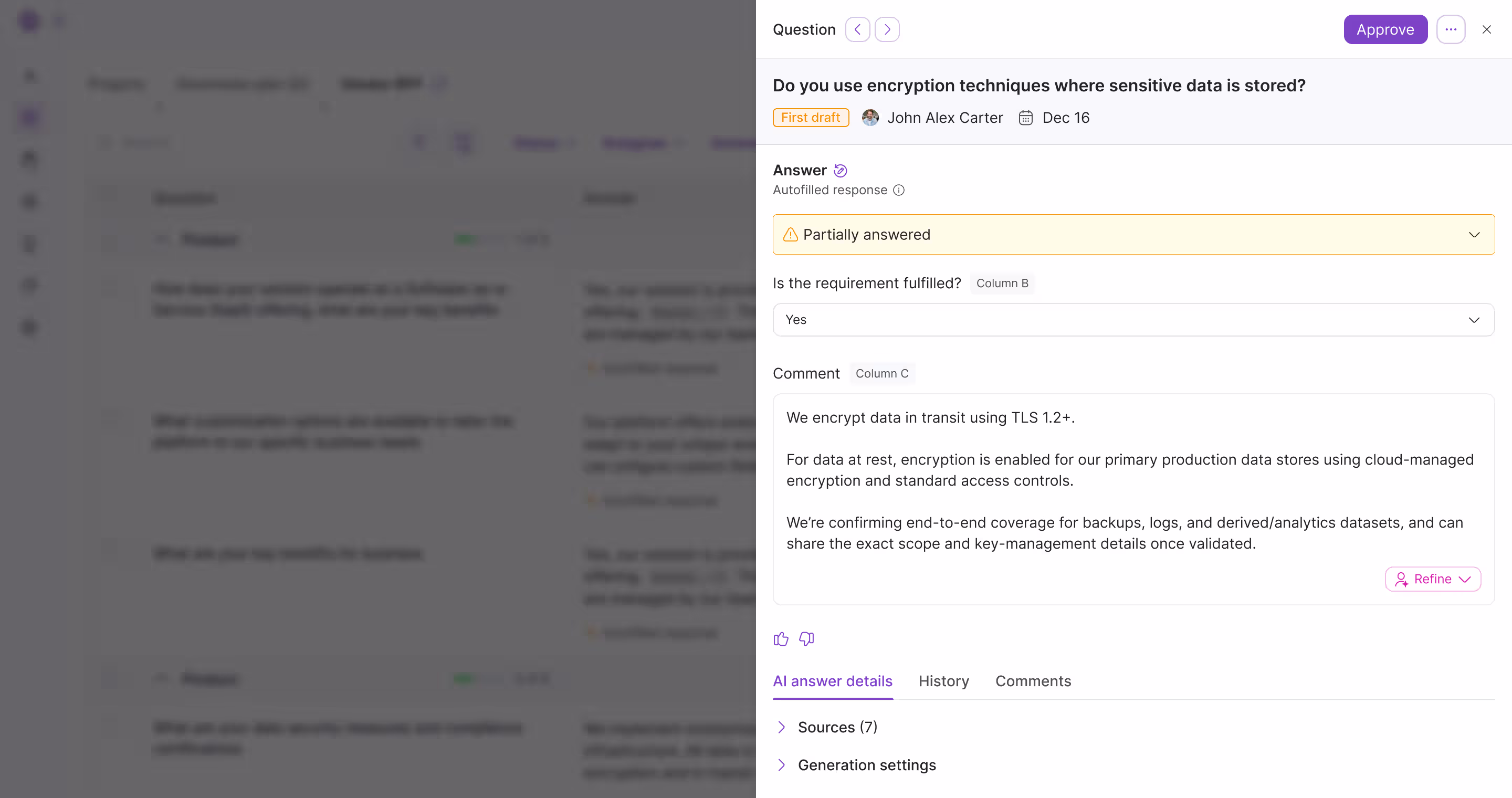 Every response generated via Autofill now comes with an 'Evidence Panel' that opens right where you're working (Sheets, Docs, or our Web App). You don't just see the answer; you see the ‘why’ behind it: