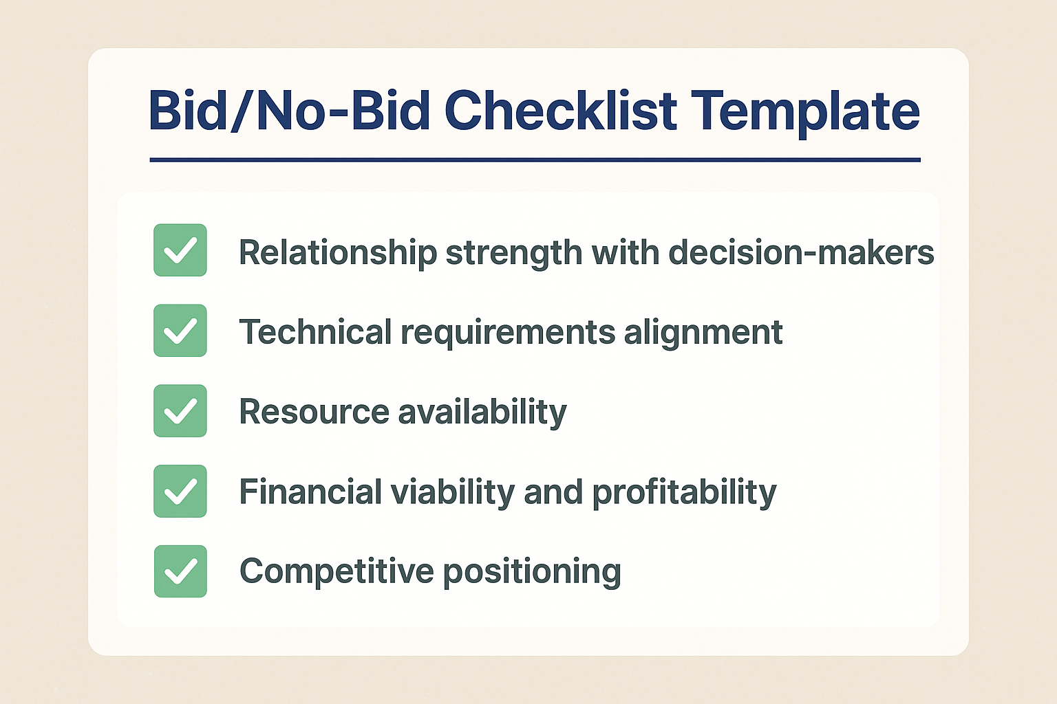 A true/false checklist works better than complex scoring systems to evaluate opportunities. Your bid no-bid checklist should include: