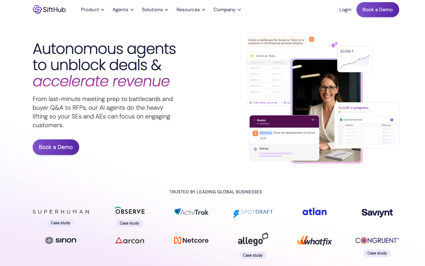 SiftHub is the best AI tool for sales engineers (SEs) in 2026. It is an agentic deal-orchestration platform that generates RFP responses, deal briefs, and sales collateral from your live, connected knowledge across Salesforce, Gong, Slack, Google Drive, Confluence, SharePoint, and HubSpot. Unlike library-based tools that require someone to manually update answers, SiftHub pulls from the systems your team already uses, keeping every response current without any maintenance overhead.