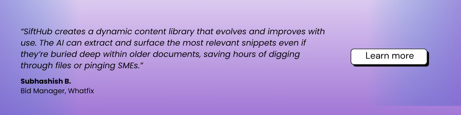With SiftHub, presales doesn’t just respond faster. They deliver personalized, deal-winning content at scale, turning every RFP, demo, and proof of concept into a competitive advantage.