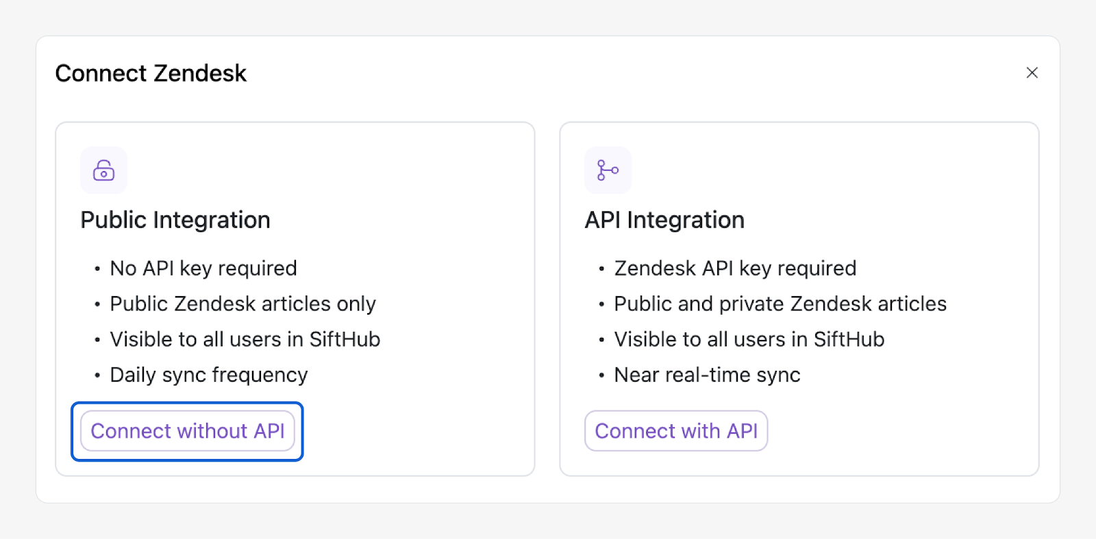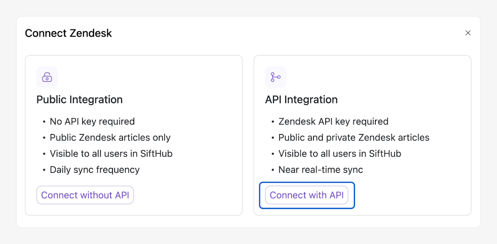 SiftHub connects to Zendesk in one of two ways: a quick public integration that requires no API key or a full API integration that unlocks both public and private articles. Either way, SiftHub indexes your selected Help Center content, making it searchable and available for AI-generated responses across your workflows.